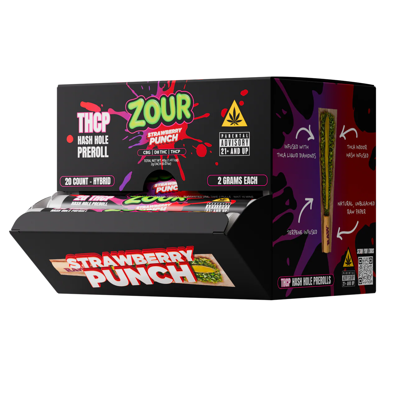 Each wholesale display includes twenty (20) Zour Stash 2G THC-P Hash Hole Pre-Rolls, individually wrapped and sealed to preserve freshness, potency, and terpene quality.